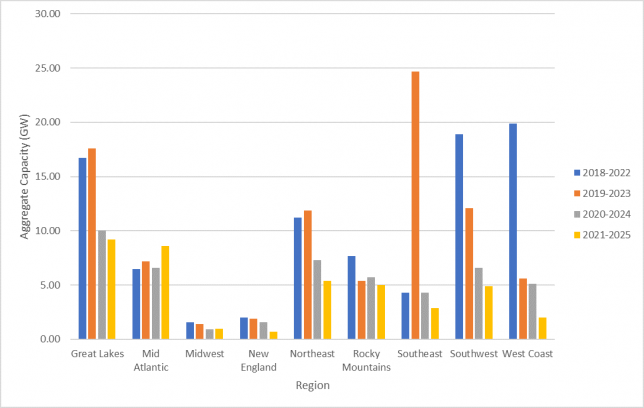 As shown in Figure 7, gas-fired power projects were all the rage for the 2018-2022 planned period, where four regions (Great Lakes, Northeast, Southwest and West Coast) each had plans to build between 10 GW and 20 GW of new gas-fired electric generation. Following a surge in the Southeast, where nearly 25,000 MW were planned to be constructed during the 2019-2023 period, new-build announcements have trended down sharply across the U.S. over the last two years.