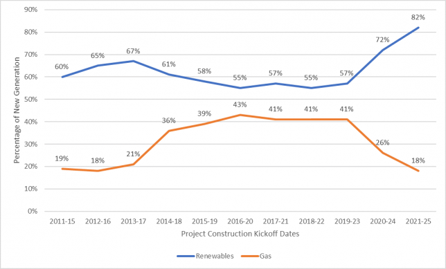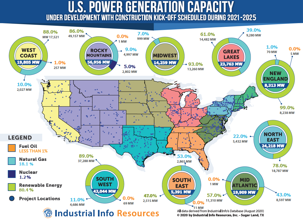 Approximately 80% of new-build generation scheduled to begin construction between 2021 and 2025 is expected to be renewables, mostly wind and solar (see map). Gas-fired generators will account for about 18% of new-build generation, with nuclear taking about 1% of the market.