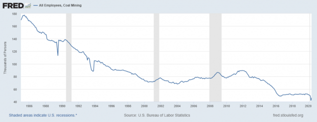 Longstanding trends like the decline in coal used to generate electricity (Figure 2) and the declining number of people working as coal miners (Figure 3) accelerated in 2020. Though coal use by electric generators is expected to increase a bit in 2021, there is little reason to think either trend will take a significant, longstanding positive turn over the next five years.