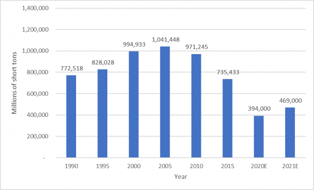 The U.S. Energy Information Administration (EIA) projects that the share of electricity produced by coal will fall from 24% in 2019 to about 18% in 2020 before rising to 21% in 2021. By contrast, coal accounted for nearly half of the electricity generated in the U.S. as recently as 2009. The EIA calculated demand for coal by electric generators would fall about 194 million short tons in 2020 from 2019 levels, but rise about 75 million short tons in 2021 (Figure 5).