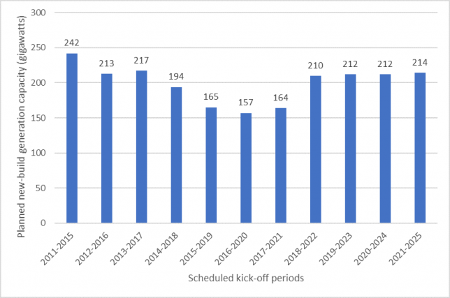 As has been the case for the last few years, renewables are getting an ever-larger slice of the new-build generation pie. About 173 GW of new renewables capacity is scheduled to begin construction over the 2021-25 period.
