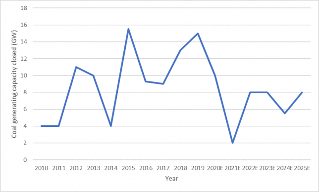 Roughly 94 GW of coal-fired generating capacity was retired between 2010 and 2019, and another 33 GW is scheduled to retire over the next five years (Figure 4).