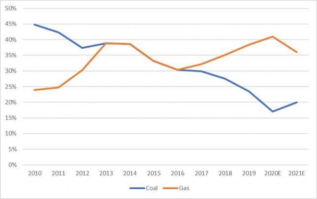 Figure 6: Coal vs. gas in U.S. electric power generation. Source: EIA.