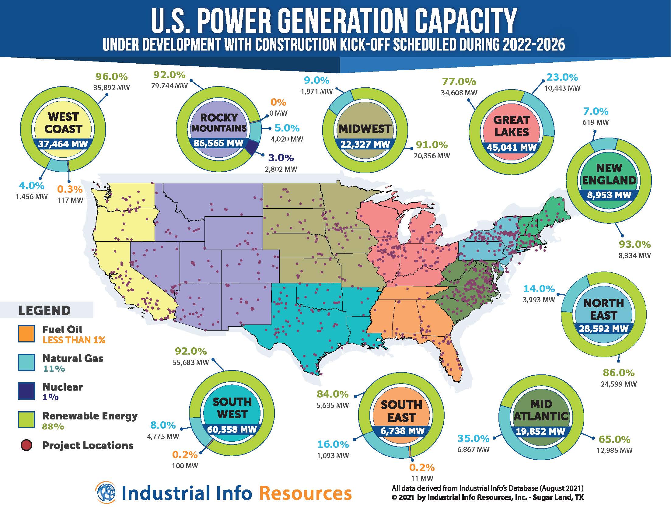 Although the COVID-19 pandemic cut overall electricity demand by 3.9% in 2020, the virus did not alter the existing trend to build fewer new power plants that burned coal or gas. For the 2022- 2026 period, Industrial Info Resources (IIR) expects renewables will continue to constitute the overwhelming majority of new-build U.S. electric generation projects, accounting for about 88% of all new electric generation capacity. Gas will account for about 11% over that five year period, with nuclear, fuel oil and coal sharing the remaining 1% of new generation construction (see map).