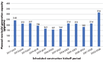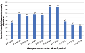 About 35,000 MW of new-build gas-fired generation is scheduled to begin construction between 2022 and 2026. That is down a little over 10% from last year’s five-year tally and about 60% less than what was planned to kick off construction during the 2019-2023 period.