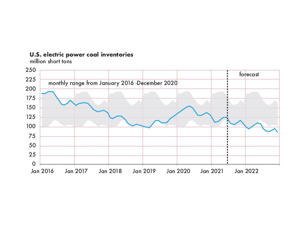 Figure 2: Coal inventories at U.S. generators forecast to fall below five-year average Source: U.S. EIA Short-Term Energy Outlook (July 2021).