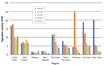 Again, all of those projects are unlikely to begin construction as scheduled. But over the next five years, the new-build renewable power business looks particularly green in the Rocky Mountains, the Southwest, the Great Lakes and the West Coast (Figure 11).