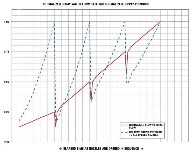 Although the water flow rate can be gradually moved up or down, this change is usually intermittent or in steps in a multi-nozzle system (Figure 2). There are several reasons for this. The minimum water pressure for atomization should be approximately 30 psi greater than the injection location. This leads to a nonzero flow at the start of washing. Additionally, when bringing spray nozzles online one at a time, the supply pressure to the opened nozzles should be quickly decreased before the next nozzle is opened. The pressure should then be increased to all open nozzles to approximate an overall ramping flow rate. This helps maintain a smoother overall temperature ramp rate.