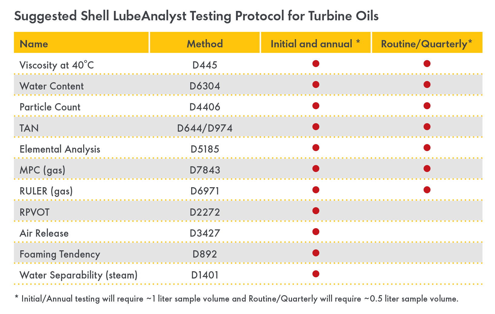 A critical component of managing the oil’s lifecycle to prevent varnish formation is performing the proper oil analysis tests at the correct intervals. The table below details the tests and intervals that should be utilized for varnish formation prevention. The most important sample in the turbine oil process is the first sample taken in the fluid’s life: It should be pulled in the first 8 to 24 hours. This sample will serve as the baseline for all future sample comparisons. A fresh, uncirculated sample as the baseline is not recommended.
