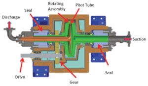 A mechanical seal(s) is used to seal the rotating case. This seal(s) is exposed to only suction pressure. Besides the items required to support a rotating body (i.e. bearing frame and bearings), all pitot pumps are composed of three major parts. Two of these parts make up the rotating case; the rotor cover and rotor. The pitot tube is placed in the center of the rotating case, and has an opening facing opposite the direction of rotation near the periphery of the case. Fluid enters the opening where the tangential velocity is diffused into pressure and conveyed back to the center of the pump where it is discharged via the shaft supporting the pitot tube (Figures 1 and 2). Pitot tube pumps are most commonly available in either coaxial suction and discharge arrangement (Figure 1) or a flow through arrangement (Figure 2) where the suction and discharge are opposed. The important difference between the two is how the pitot tube penetrates the rotating case. In the coaxial arrangement, the pitot tube penetrates through the eye of rotor cover increasing the NPSHr, especially on light hydrocarbons. This arrangement is subject to hydraulic thrust; however, it requires only one seal.
