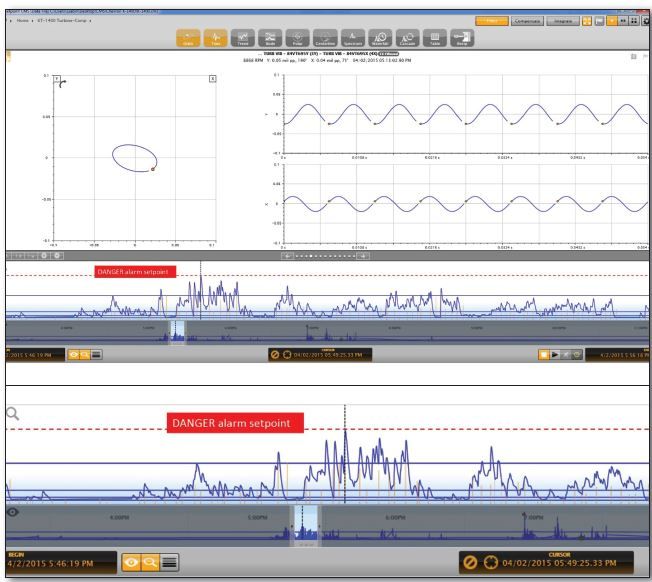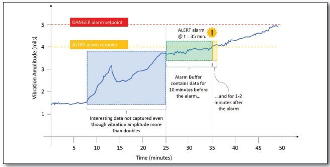 It is not unusual for vibration levels in normal operation to be only 10% of alarm levels, such as a compressor set to alarm at 4 mils and trip at 5 mils of radial vibration, but running normally at 0.5 mils. In such a case, vibration amplitudes would need to increase by a factor of 8 for an alert and a factor of 10 for a trip, either of which would trigger a hardware alarm and freeze the corresponding alarm buffer.