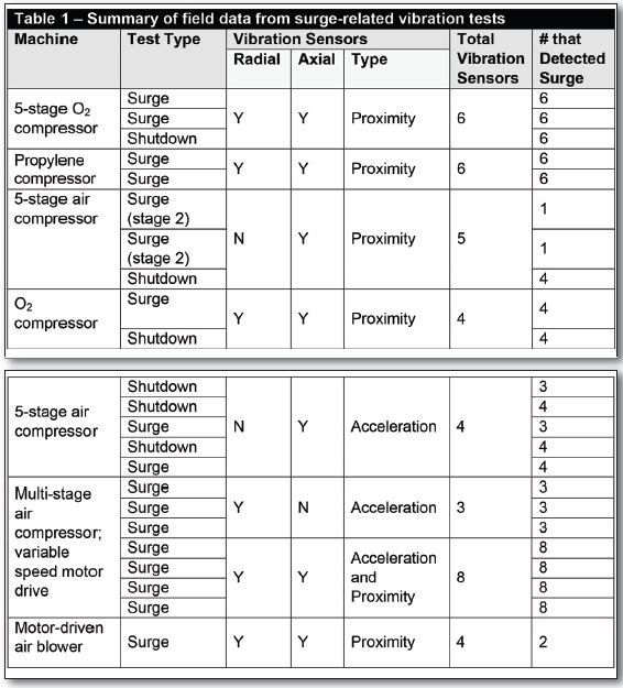 Depending on where vibration sensors are mounted, and the compressor stage at which stall and surge may be occurring, it is possible to observe a simultaneous rise in vibration. For example, 14 separate surge tests conducted across seven separate compressor trains showed a 100% correlation between vibration and surge, observed by almost every vibration sensor on the machine (Table 1).